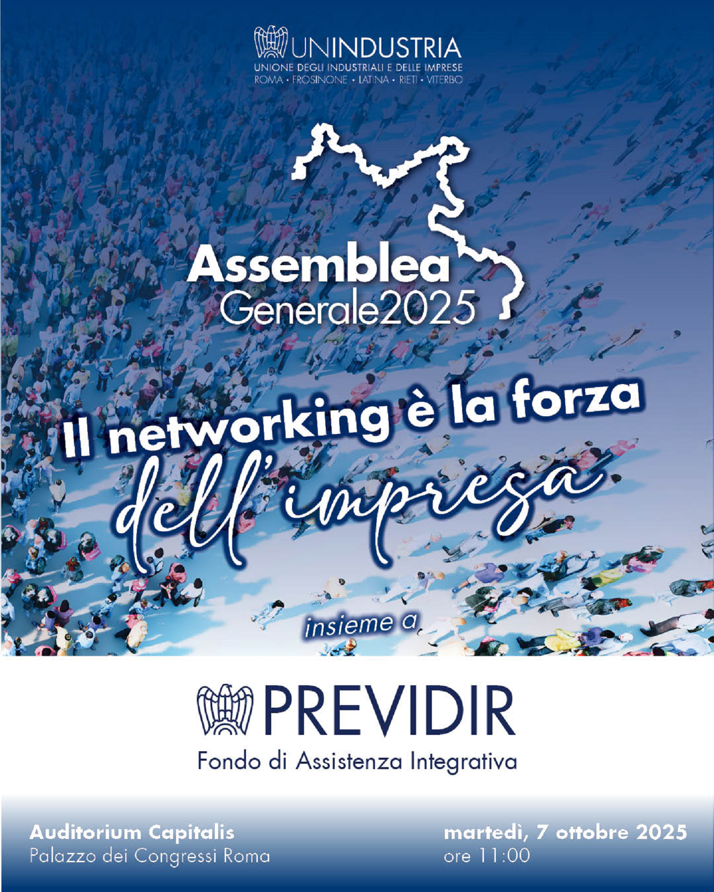Quest’anno l’Assemblea Generale di Unindustria, in programma martedì 7 ottobre 2025 alle ore 11.00 al Palazzo dei Congressi di Roma, diventa anche il luogo dove la business community si incontra per fare rete, creare collaborazioni e crescere insieme. Un’occasione da non perdere per costruire il futuro e dare forma al cambiamento. Noi ci saremo!”