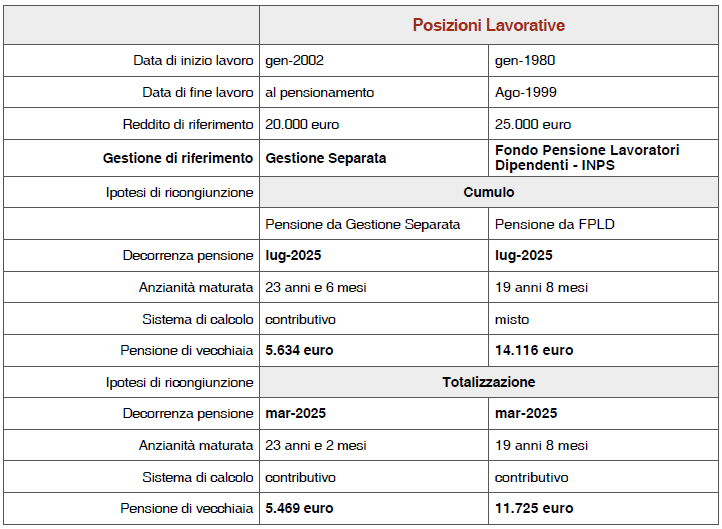 Prendiamo ad esempio un soggetto, che ha a oggi 60 anni, iscritto alla Gestione Separata INPS dal 2002 e che ha versato in passato 19 anni e 8 mesi di contributi al Fondo Pensione Lavoratori Dipendenti. In assenza di interventi, i contributi da lavoro dipendente non danno diritto a pensione. Avvalendosi del cumulo gratuito, gli consentirebbe di ottenere un’unica pensione, calcolata sempre in pro-quota, ma senza ricalcolo contributivo delle annualità di lavoro dipendente come avverrebbe per la totalizzazione. In caso di cumulo la pensione si ha 4 mesi dopo rispetto al caso in cui si avvalesse della totalizzazione contributiva. La pensione risulta essere più elevata rispetto a quella totalizzata, per via del ricalcolo contributivo già accennato.